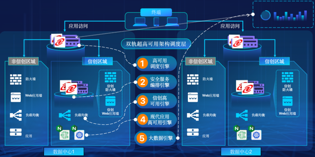 双轨超高可用架构拥有五大引擎,分别是:高可用调度引擎、安全服务编排引擎、现代应用高可用引擎、信创高可用引擎、大数据引擎,可以帮助客户在新架构下, 提升应用可持续性,解决性能瓶颈,提升稳定性。在服务异常情况下,可以顺利获得实时灰度调度的方式,实现业务的应急逃生,保留应用故障现场环境,便于后续的排错与根因定位。